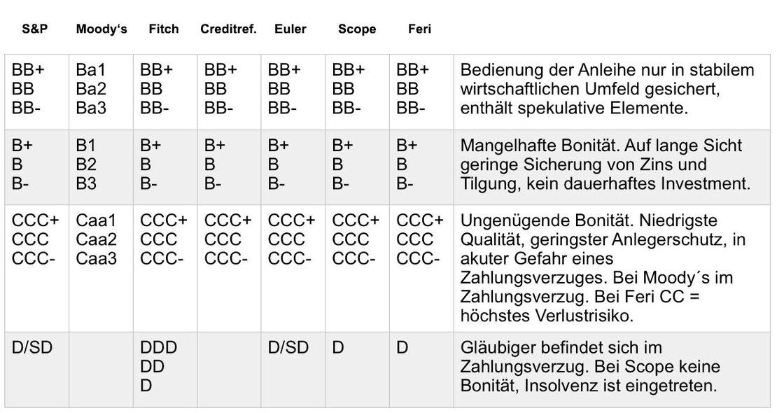 In der zweiten Tabelle sind die Ratingcodes der Agenturen nebeneinander gestellt, welche die Kategorie „Speculative Grade“ bilden. Sie beginnen mit der Bonitätsstufe BB+ bzw. der Stufe Ba1 (Moody's), bei denen die Bedienung der Anleihen nur in einem stabilen wirtschaftlichen Umfeld gesichert ist. Das bedeutet, dass sie bereits spekulative Elemente beinhalten.